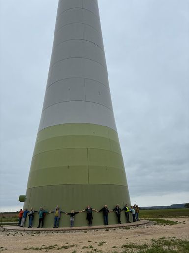 Die Aussicht am Windkraftwerk wird für ein tolles Gruppenfoto genutzt.